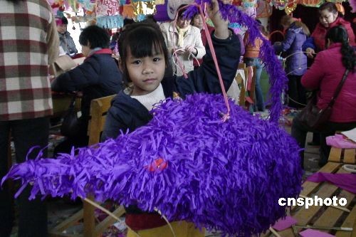 二月二十日,广西南宁市菠萝岭社区居民忙着扎制花灯,一女孩展示扎制好的鼠形花灯。过元宵赏花灯是当地习俗。中新社发 王刚 摄