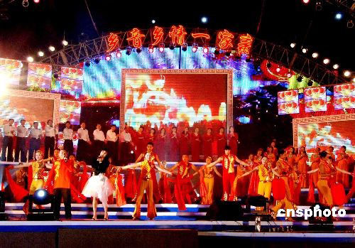 2月20日正月十四晚,前来参加“乡音乡情一家亲”2008“两马同春闹元宵”大型焰火文艺晚会演出的马尾合唱团、马尾大头娃娃表演队与马祖合唱团、马祖电音孩仔演出队的成员共同上演开场歌舞《今宵多美好》。“两马同春闹元宵”活动已经成功举办五届。中新社发 刘可耕 摄