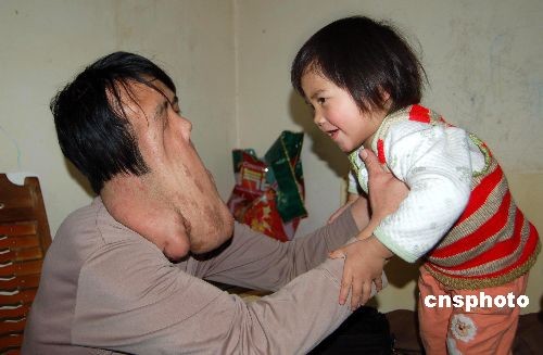 近日,广西省南宁和桂林分别出现两名“象面人”。图为出生于1975年的广西南宁名为何良的男性“象面人”和可爱的女儿。这是一种由疾病引起的面部畸形,被称为“神经纤维瘤”,为一种常染色体显性遗传病。因家庭经济条件困难,何良现阶段无法实施手术。中新社发 刘万强 摄