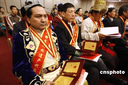 2月28日,由中国文化部主办的国家级非物质文化遗产项目代表性传承人颁证仪式在人民大会堂举行。88位来自各省、自治区、直辖市的第二批国家级非物质文化遗产项目代表性传承人代表出席了仪式。这次公布的第二批国家级非物质文化遗产项目代表性传承人共551名,包括了民间音乐、民间舞蹈、传统戏剧、曲艺、民俗等五大类。传承人颁证仪式的举办能够让更多的人认识中国非物质文化遗产的价值,从而进一步推进非物质文化遗产保护工作。中新社发 杜洋 摄