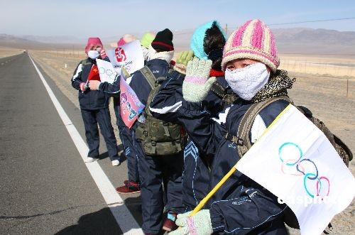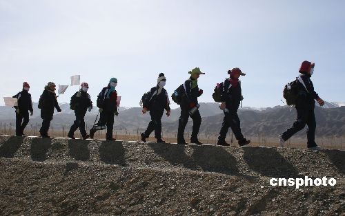 2月28日,新疆哈密伊吾县八名农牧民妇女从302省道50公里处走过。2月27日,新疆哈密伊吾县八名农牧民妇女为庆三八、迎接奥运自发组织徒步行走208公里,此次活动将用八天时间走完全程。她们的行动受到了沿途农牧民的支持和好评。中新社发 普拉提 摄