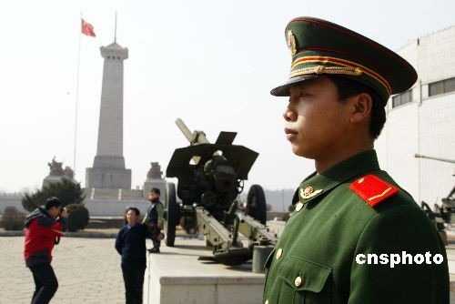 3月1日,丹东边防检查站的值勤战士正在丹东抗美援朝纪念馆执行警卫任务。作为辽宁省五家大型博物纪念馆之一的抗美援朝纪念馆当天正式向公众永久免费开放,有1000多名国内外游客和市民进入纪念馆参观。为纪念抗美援朝战争胜利55周年,纪念馆建馆50周年,展馆新增设的专题展览成为当天开放接待参观的亮点。中新社发 陈浩浩 摄