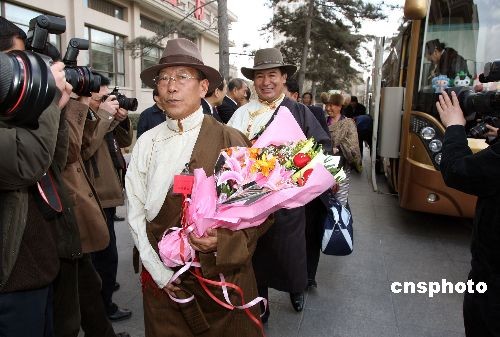 3月2日,出席十一届全国人大一次会议的西藏代表团抵达驻地北京京西宾馆,受到热烈欢迎。前者为新杂·单增曲折代表(西藏自治区人大副主任),后者是多吉次珠代表(拉萨市市长)。中新社发 任晨鸣 摄