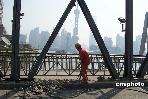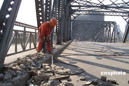 3月3日,上海外白渡桥移桥前期施工正在展开。施工人员在去除桥面混凝土层,外白渡桥在拆下一些零部件后,将被整体吊装,分两部分用驳船移至船厂大修。中新社发 周东潮 摄