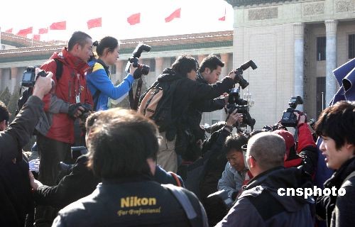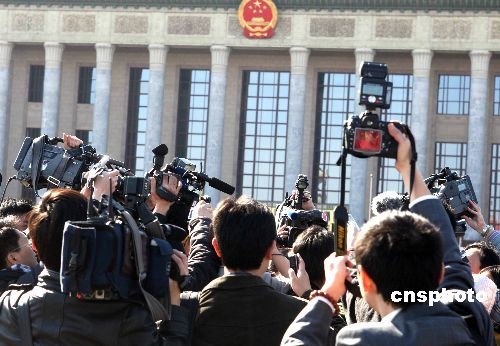 3月3日下午,全国政协十一届一次会议在北京人民大会堂开幕,一场3000媒体人报名参加的新闻大战拉开序幕。中新社发 张宇 摄