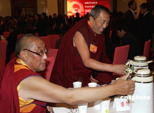 三月三日下午,全国政协十一届一次会议在北京人民大会堂隆重开幕,来自西藏的全国政协委员在会场喝到可口的茶水,深感“宾至如归”。中新社发 潘索菲 摄
