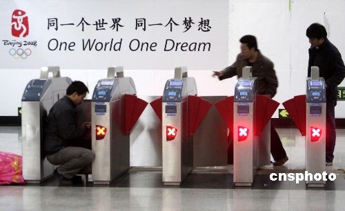 3月3日,工作人员在调试北京地铁1号线天安门东站的自动检售票系统。随着奥运会临近,北京地铁1、2号线的新设备配套系统正在加紧调试,以便服务奥运会的正常使用。据工作人员介绍,地铁车站安装的新设备是自动检售票系统,出入口处的是闸机,其相应的配套设备还有自动售票和充值机。目前5号线已全线调试完毕,但还需时间对地铁1、2、13号线进行调试,预计6月后,北京地铁线路都要开通和使用自动检售票系统。中新社发 吴芒子 摄