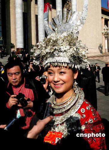 3月4日上午,十一届全国人大一次会议举行预备会,来自贵州黔东南地区的苗族姑娘雷阿幼朵备受记者关注。 中新社发 王辉 摄