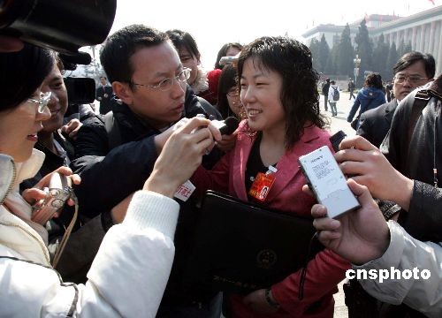 三月五日上午,打扮时髦的上海农民工人大代表朱雪芹,出席在北京人民大会堂举行的十一届全国人大一次会议开幕会时,成为媒体记者采访的焦点。中新社发 潘索菲 摄