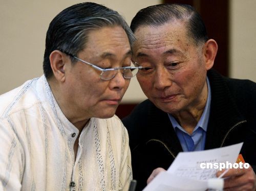 3月5日下午,全国政协十一届一次会议进行政府工作报告小组讨论,梅兰芳大师之子梅葆玖(右)与京剧名家张学津参加文艺小组讨论。梅葆玖任北京京剧院梅兰芳京剧团团长。张学津是北京京剧院一级演员。中新社发 盛佳鹏 摄