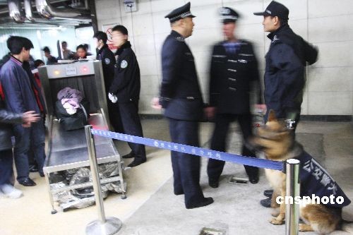 3月7日,北京东直门地铁车站里,一些民警正带着他们的公交警犬执勤,对旅客的行李进行安检,以确保“两会”期间旅客的出行安全。中新社发 追影 摄