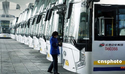 3月8日,北京首批采用“京剧脸谱”造型的50部新型环保双层公交车亮相三环路,它们将在本月10日替换下特8路内环原有的旧双层车,改善交通环境服务奥运。“新双层”车身长12.6米,满载量达100人,使用欧IV柴油发动机。首批50辆新车主色调呈银灰色,下个月还将有13辆新车上路。中新社发 郑雄增 摄