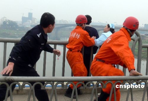 3月8日,广西南宁白沙大桥上,消防和公安人员解救一名轻生男子。据悉,该男子在小孩生病、父亲遭车祸等诸多家事的压力下,一时想不开做此举动。中新社发 吴斐雄 摄