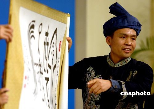 三月十日,贵州水族人大代表张加春在记者会上介绍“水文字”,并呼吁要大力保持“水文化”的独特性。当日,八位少数民族代表在北京两会新闻中心接受媒体采访。中新社发 王东明 摄