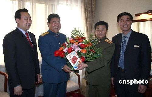 三月十一日,全国政协委员驻地北京京丰宾馆,三十位迎来生日的委员收到驻地工作人员送来的生日鲜花。图为总后管理局副局长王会军(右二)、京丰宾馆总经理刘东卫(左一)、京丰宾馆书记李如峰(右一),将生日花篮和贺卡送到广州军区原副政委兼广州军区空军政委朱永清中将(左一)的住房。中新社发 盛佳鹏 摄