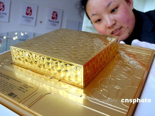 3月11日,青岛江西路一家奥运商品特许店工作人员正将一块纯金“水立方”模型摆上柜台,其中最大的“水立方”模型售价240万元。 中新社发 赵健鹏 摄