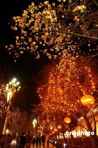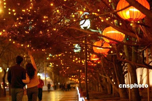 3月12日夜晚,一对情侣在北京西长安街的红墙外观灯、赏花。两会期间,北京长安街红灯笼高挂,与盛开的玉兰花相映,烘托出庆祝气氛。中新社发 盛佳鹏 摄