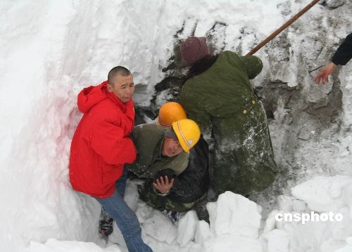 3月13日上午11点20分左右,位于新疆天山果子沟的西气东输二线工程一处隧道施工现场发生雪崩,目前已知有6名被困在隧道内的工人获救。由于隧道口被大雪掩埋,被困人数不详,搜救工作仍在持续中。图为现场救援人员救出一名被困工人。中新社发 马耀林 摄