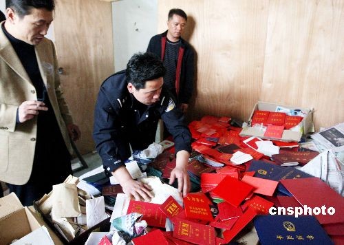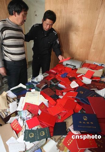 3月19日,河南洛阳警方在一民宅内将一伙制造假证的犯罪集团逮个正着。行动中查获各类假证7大类145种共计10000多份,现场还查获印章、钢印、电脑、打印机等一批制假造假设备。在事实面前,犯罪嫌疑人对犯罪事实供认不讳。中新社发 曾宪平 摄