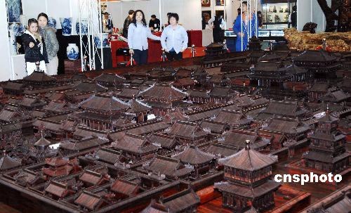 3月20日,为期5天的“第六届全国工艺品、旅游品、礼品博览会暨第十一届春季(大连)中国古玩艺术品博览会”在大连星海会展中心举行。在展会西厅区,一个一展现古都风貌喜迎2008年奥运会为创作宗旨的按正式比例缩小120倍的紫檀巨雕故宫全景,吸引了众多市民的眼球。这个作品9米长,宽7米,总面积60余平方米,由50余位高级技师历时6年精心雕制而成。该作品无论从用料、耗时都令人称绝。如此大型紫檀木雕艺术作品也实属罕见。中新社发 刘德斌 摄