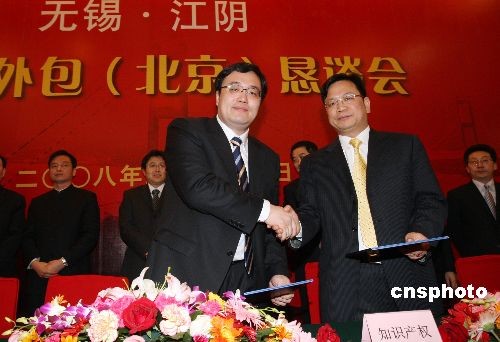 3月21日,江苏省无锡市委市政府、江阴市委市政府与江苏力多文化传播有限公司在北京举行“动漫及服务外包产业(北京)投资说明会暨与江阴临港新城入驻签约仪式”,无锡、江阴位于中国内地经济最具活力的长江三角洲都市圈的几何中心,无锡市委市政府、江阴市委市政府关于软件和文化创意产业的相关政策,把支持产业发展,特别是创意文化产业发展作为一项战略任务来实施,把动漫产业作为重点扶持产业之一给予高度重视,争取用第一个五年时间打造完善的动漫产业链结构,形成规模性的产业集团。图为江阴临港新城与力多文化传播有限公司签约合作项目。中新社发 钱兴强 摄