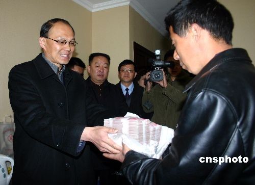 从3月30日起,西藏自治区政府将陆续向“3·14”打、砸、抢、烧严重暴力事件中无辜丧生者家属发放特殊抚恤金,金额为每人二十万元人民币。图为3月30日西藏自治区政府官员正在向无辜丧生者家属发放特殊抚恤。中新社发 邹辉 摄