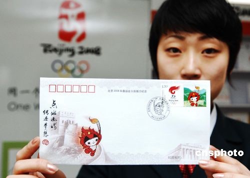 4月1日,由中国集邮总公司发行的一枚“北京2008年奥运会火炬接力纪念封”在全国发行,发行量为8万枚。中新社发 刘德斌 摄