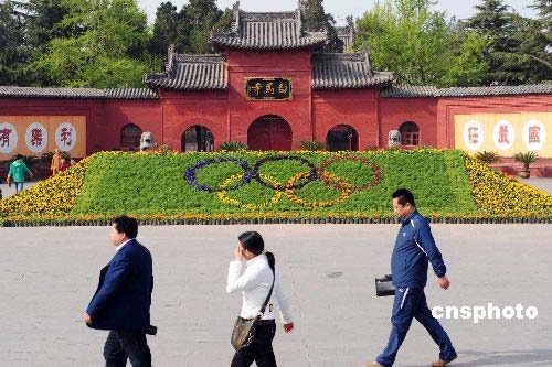 4月初,为了迎接2008奥运会的到来,中国第一千年古刹洛阳白马寺用花卉制作了大型彩色奥运五环图案。 中新社发 高山岳 摄