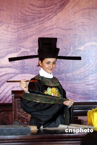 四月二日,国际旅游小姐在河南开封“开封府”扮作包公升堂。当日,二零零八国际旅游小姐在河南开封巡游。中新社发 慎重 摄
