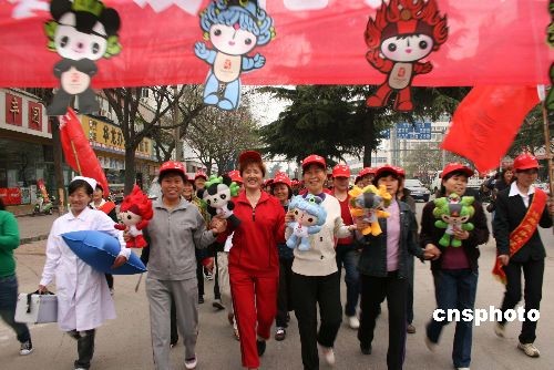 4月7日,河南南阳市卧龙区60多位社区大妈以慢跑形式,迎接北京奥运会。本次名为“春暖花开迎奥运”的慢跑活动,总路程为五公里,大妈们以饱满的精神、骄健的步伐充分释放喜迎奥运的激动心情。中新社发 付海厚 摄