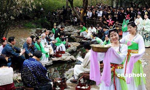 4月8日上午,中日韩书法家在书圣王羲之的浙江绍兴兰亭交流书艺、进行曲水流觞饮酒作诗仿古雅趣活动。当日,第24届中国兰亭书法节在浙江绍兴举行。来自中国、日本、韩国的42位书法家及数百名书法爱好者参加书法盛宴。中新社发 袁云 摄