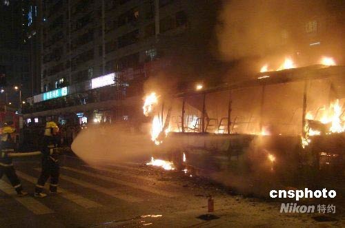 四月九日晚二十一时三十分许,重庆市区一辆载有十余名乘客的公交车在行进中起火燃烧。消防人员迅速赶到现场扑救,由于乘客疏散及时,未造成人员伤亡。出事公交车烧得面目全非,起火原因在进一步调查中。中新社发 万明 摄