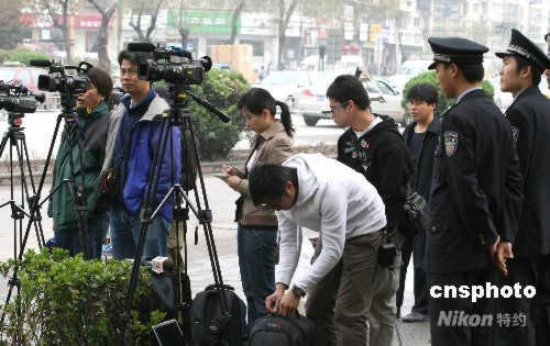 4月11日,天津市第二中级人民法院开庭对原中共上海市委书记陈良宇做一审判决。清晨开始,就有包括香港媒体在内的多家媒体记者聚集在天津二中院附近进行跟踪报道。中新社发 齐天 摄