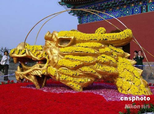4月18日,金碧辉煌的中国龙造型在鲜花簇拥中出现在天坛公园西下坡花坛,表现出龙腾盛世的宏大场面。 这是天坛公园为迎接4月20日开始的北京国际马拉松赛精心设计的。设计立意采用天坛祭天神乐礼器“麾”的造型,麾是韶乐演奏时用来传达音乐起始的号令,其立意在于体现马拉松测试赛吹响了即将到来的奥运号角。中新社发 九州 摄
