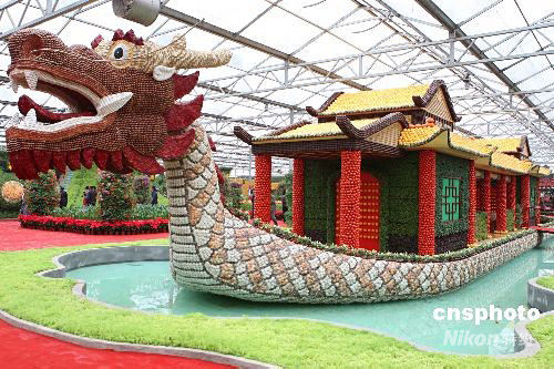 4月20日,一条名为“九船载福”的龙船在中国(寿光)国际蔬菜科技博览会中展出,其高4.4米、长31米,共用花生果1.6万颗,各种菜豆类种子2万余粒,南瓜3.2吨,西红柿鲜果4千公斤,朝天椒盆栽680盆,船体镶嵌贝壳29万片,各色菜苗1.6万株,由29名工匠耗时4个月建成。本届菜博会在山东寿光举办,主题是“现代·科技·希望”,展区面积达35万平方米,拥有13个展厅,2000多品种,200多个蔬菜景点景观。中新社发 赵隽 摄