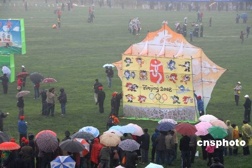 4月21日,绵绵春雨将山东潍坊浮烟山风筝放飞场描绘的更加艳丽,在 “喜迎2008北京奥运”万人风筝放飞暨第四届世界风筝锦标赛、中外运动风筝邀请赛现场,五彩斑斓的风筝与花花绿绿的雨伞相映成趣,构成了一幅绝妙的春日风情画。作者: 王晓光