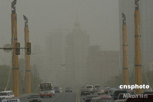 4月23日下午,在新疆库尔勒市街头,汽车在沙尘当中行驶。在4月18日--19日遭遇沙尘暴袭击后,新疆库尔勒于23日下午16时开始,再次遭遇沙尘袭击。中新社发 确·胡热 摄