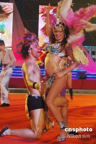 4月25日晚,2008首届中国昆山国际文化旅游节在江苏省昆山市开幕。在随后举办的国际风情嘉年华活动上,由国内外20多个文艺团队联袂进行巡游路演。图为来自巴西的“桑巴舞”表演。中新社发 邱勇 摄