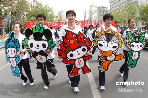 4月30日上午,新疆巴州举行万人火炬拉力长跑活动,迎接奥运倒计时100天。由部队、兵团、油田、铁路和地方组成的万人火炬拉力长跑队伍参加了全程11公里的火炬拉力长跑活动。中新社发 确·胡热 摄