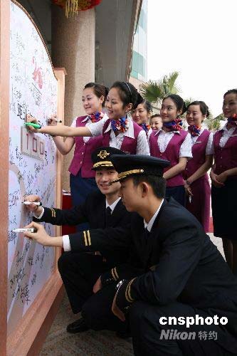 4月30日,北京奥运会倒计时100天,四川航空公司100多名职工用签名书写祝愿的方式,表达对北京奥运会的祝愿与期许。中新社发 葛振林 摄