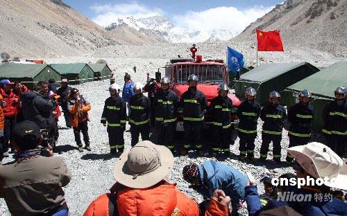 4月30日,受邀采访2008北京奥运会火炬接力珠峰展示活动的中外媒体记者,集体探访珠峰大本营,采访驻扎在珠峰大本营的消防官兵。中新社发 盛佳鹏 摄