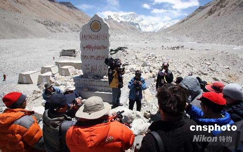 4月30日,北京奥运会倒计时100天,受邀采访2008北京奥运会火炬接力珠峰展示活动的中外媒体记者,集体在珠峰大本营探营。图为他们在珠峰大本营珠穆朗玛峰高程测量纪念碑前集体进行采访。中新社发 盛佳鹏 摄