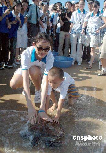北京奥运会火炬接力海南省传递五月四日传递将在三亚首发。三日,联想和"蓝丝带"在三亚组织保护海洋活动,倡导绿色奥运。图为世界小姐张梓琳和孩童在三亚湾海边放归大海龟。中新社发 王辛莉 摄