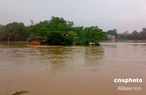 五月四日,广西部分沿海城市突降暴雨,大雨滂沱数小时,降雨量竟达全年平均降雨量的五分之一,造成部分地区出现水涝。图为广西北海市合浦县白沙镇五里牌村被洪水淹没的房屋。中新社发 罗毅强 摄