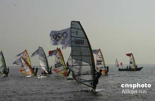 5月6日上午8时10分,北京奥运圣火在海南省海口市传递,为海南省夺得首枚全运会金牌的女子帆板运动员王丽芳传递第一棒火炬。图为海口西海岸海上帆板队挂满奥运五环旗祝贺奥运圣火在海口传递。中新社发 尹海明 摄