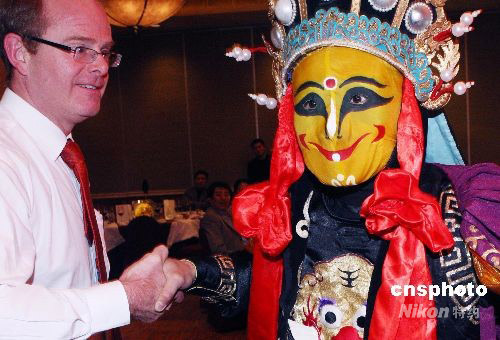 5月6日晚,在北京举行的中外商贸合作项目洽谈酒会上,来自四川的著名变脸艺人为嘉宾现场进行精彩的“变脸”,表演受到在座外国宾客的热烈欢迎。中新社发 钱兴强 摄