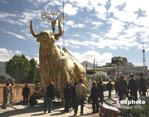 5月7日,位于拉萨市北京中路的被誉为拉萨古城市标的铜雕“牦牛”,因布达拉宫周边环境整治的需要,搬离原处,落户旁边的休闲公园。这对重达数吨的铜牛,是“老西藏精神”的象征,见证了西藏和谐稳定和快速发展。图为铜牛落户新址。中新社发 贾长飞 摄