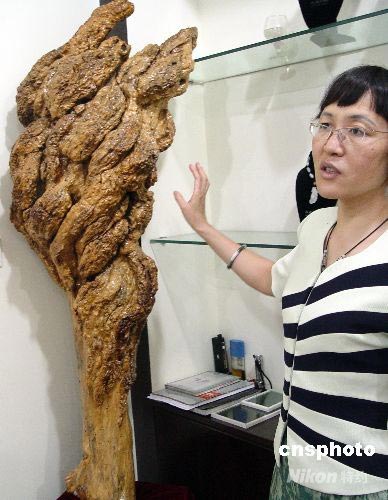 5月7日,河南郑州一件酷似“祥云”火炬形状的根雕吸引了众多市民的关注。据悉,这件根雕高达一点五米,最大围径零点六米,重约三十千克,树龄在八十至一百年左右,从外观看十分形似“祥云”火炬。中新社发 李志全 摄