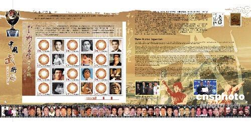 5月9日,全球首部以详尽介绍武术发展为选题的邮票珍藏册《中国武术》在北京举行了首发式。鉴于李小龙将中国武术推向世界的贡献,中国武术协会特意留出一个版面专门介绍,并首次推出不干胶的李小龙肖像个性邮票,肯定了其在武术界的地位。中新社发 王欢 摄