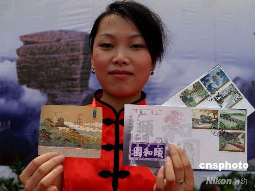5月10日,印江邮政工作人员展示《颐和园》邮票。当天,《颐和园》特种邮票一套6枚和1枚小型张在贵州印江首发, 印江土家族苗族自治县举办了庆祝《颐和园》特种邮票发行活动。《颐和园》邮票内容是十七孔桥、长廊、石舫、谐趣园、玉带桥、后湖,小型张是佛香阁。这套邮票是继长城、故宫、天坛后发行的又一套北京名胜题材邮票。《颐和园》三个字,是清代书法家、贵州印江的严寅亮所书。中新社发 陈晓岚 摄